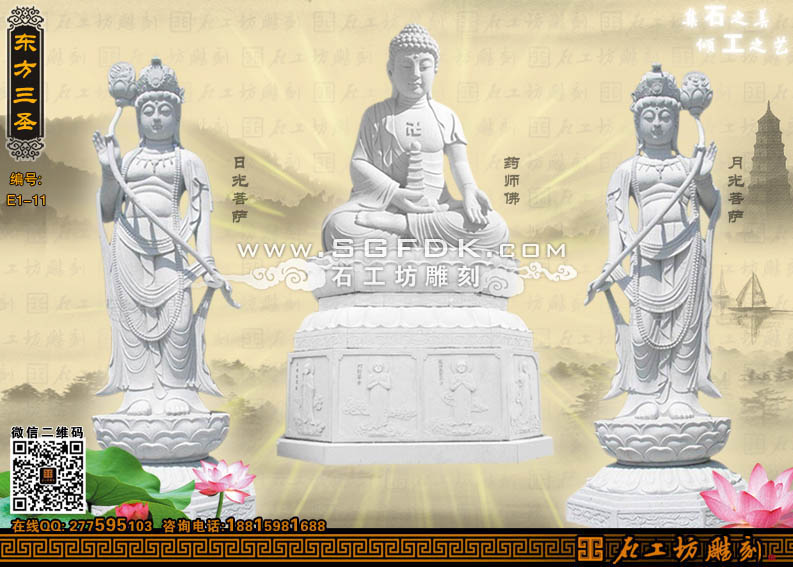 藥師佛是東方淨(jìng)琉璃世界的教主。這個位于東方的淨(jìng)琉璃世界,是佛教理想中的「淨(jìng)土」樂園。藥師佛曾立下十二大愿,要使淨(jìng)琉璃世界的一切居民、無病無災(zāi),豐衣足食,解脫苦厄。藥師佛除與釋迦佛、彌陀佛在大雄寶殿共同享用人間香火外,還有自己的「藥師殿」、「藥王殿」。(與中國道教的藥王廟是兩碼事),殿內(nèi)正中為藥師佛,兩旁是他的左右脅侍日光菩薩和月光菩薩,合稱「藥師三尊」,又叫「東方三圣」。藥師佛的典型形象是左手持體,內(nèi)盛甘露,右手持藥丸。