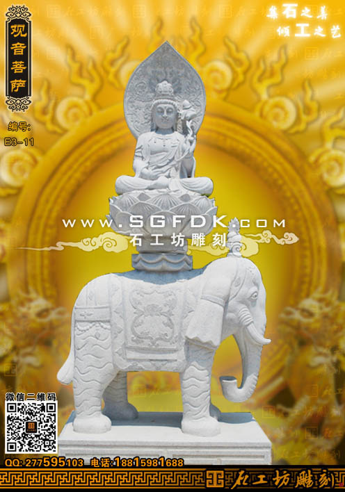 普賢菩薩的法像一般為戴五佛冠金色身, 右手持劍左手結(jié)施愿印, 半跏趺坐于六牙白象之上.