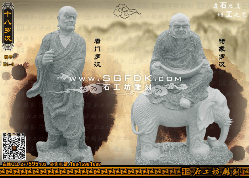 石雕羅漢-看門羅漢:注茶半托迦尊者,騎象羅漢:迦理迦尊者