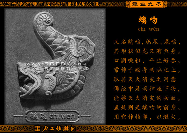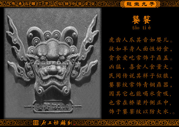 龍自古是皇族的象征,皇有皇子,龍王便有龍子!褒埳抛映升垺钡膫髡f在我國由來已久。所謂的“九子”其實并不是只有九個,九在中國文化里是虛表極數(shù)很多的意思。意思是說龍有很多個孩子,可是沒有一個真正像龍的。龍生九子的說法流傳的歷史很久,但是具體是哪九個龍子沒有明確的說法。真到明代的一些文人雜記當中才不斷被歸類提到,龍生九子的說很多,版本各不一。龍生九子的“九子”只要有:囚牛、睚眥、嘲風、蒲牢、狻猊、赑屃、狴犴、螭吻、饕餮、椒圖、蚣蝮、麒麟等這些神獸(資料來源:石工坊雕刻)。