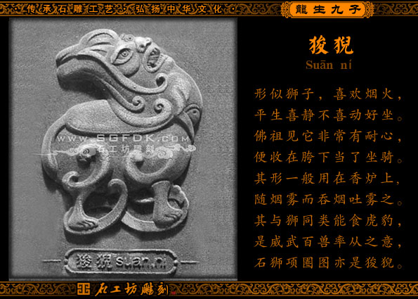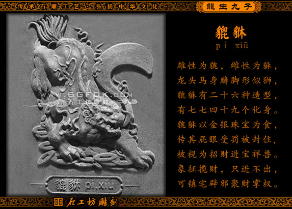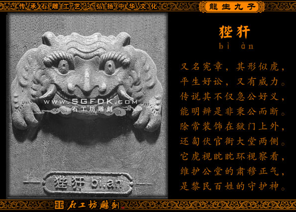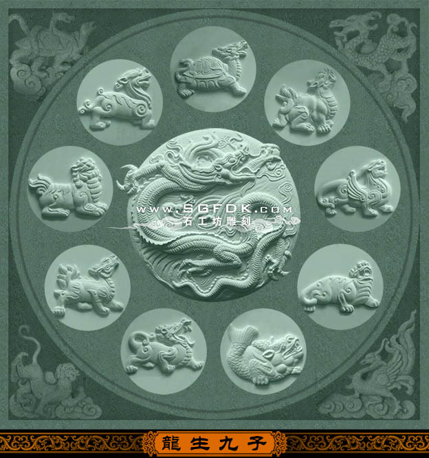 一種說法說是一位龍母,生了九個兒子,這九個兒子各有各的長相,脾氣和愛好也各不相同。明代一些學人筆記,如陸容的《菽園雜記》、李東陽的《懷麓堂集》、楊慎的《升庵集》、李詡的《戒庵老人漫筆》、徐應秋《玉芝堂談薈,龍生九子》、《天祿識余·龍種》都各有記載。 (資料來源:石工坊雕刻)。