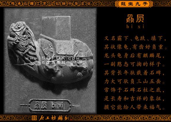 長子赑屃(bìxì),又名霸下,形似龜,喜歡馱重物,我們常見到一些寺廟的石碑底下的石碑便是它。相傳它力大能背起三山五岳,并常興風作浪。后被夏禹收服,為夏禹立下不少汗馬功勞。