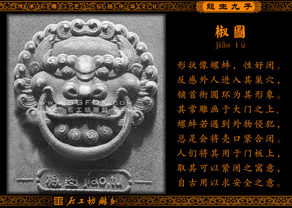 八子椒圖(jiāo tú),形似螺蚌,好閉口,性情溫順,有些自閉非常反感別人進它的巢穴,人們就常將其形象雕在大門的鋪首上,或刻畫在門板上。性好僻靜,鎮(zhèn)守門邊以照顧家庭的安寧,常成為大門上的銜環(huán)或擋門的石鼓。
