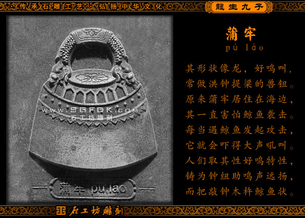 四子蒲牢(púláo) ,形狀比較像龍,但是比龍小些,它喜歡音樂和鳴叫,人們就將其形象置于鐘上,求其聲大而亮,洪聲揚播。