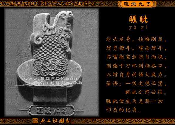 六子睚眥(yá zì),樣子像豺狼,但是它頭上卻長了龍角,怒目而視,雙角向后緊貼背部。嗜殺喜斗,刻鏤于刀環(huán)、劍柄等兵器或儀仗上起威懾之用。