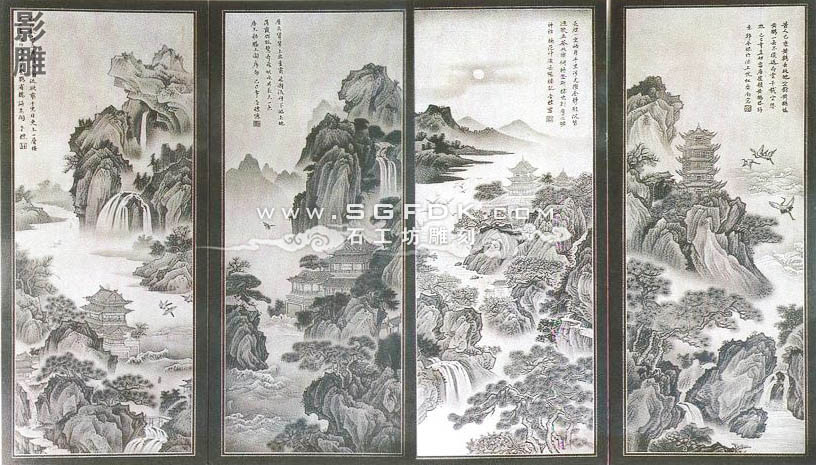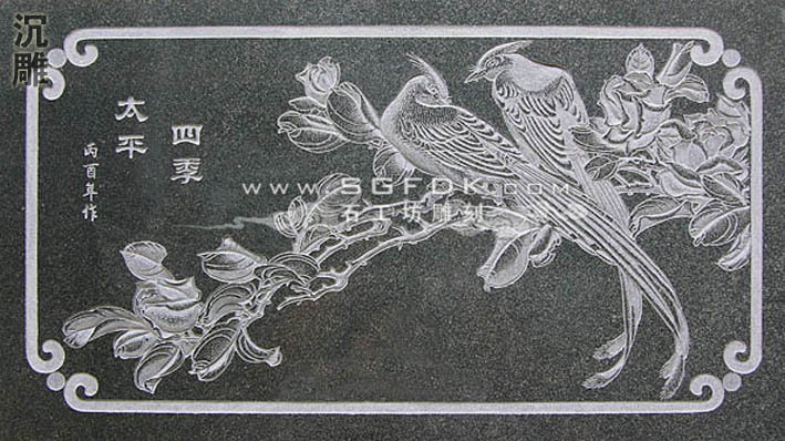 3、沉雕:又稱"線雕",即采用"水磨沉花"雕法的藝術(shù)品。此類雕法吸收中國(guó)畫(huà)與意、重疊、線條造型散點(diǎn)透視等傳統(tǒng)筆法,石料經(jīng)平面加工拋光后,描摹圖案文字,然后依圖刻上線條,以線條粗細(xì)深淺程度,利用陰影體現(xiàn)立體感。此類產(chǎn)品多數(shù)用于建筑物的外壁表面裝飾,有較強(qiáng)的藝術(shù)性。