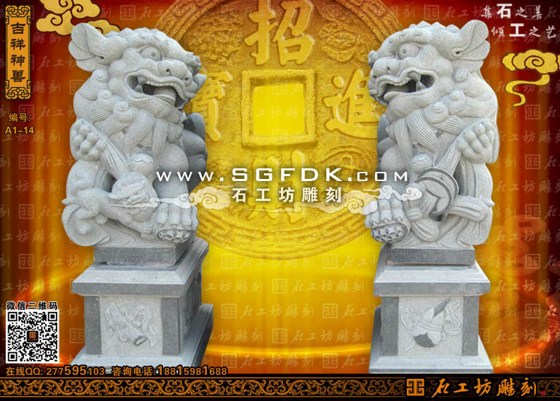 我國最早有文獻記載石獅子的是《后漢書》,該書記載東漢有石獸,刻有“辟邪”字樣!氨傩啊笔氰笳Z音譯,譯意為大獅子。二千年來,中國歷代的能工巧匠曾塑造過千姿百態(tài)、適用于不同場合不同功用的中國特色的石獅子。由于地域文化的不同,中國各地的石獅子都略有不同。獻錢獅:是因石獅造型前一般常飾一串古錢而得名,它是南方石獅當中的一種造型。獻錢獅寓有招財進寶之意,造型可愛乖巧,富有靈性。它是民間最為常見的一種石獅造型之一,常擺放于寺廟或是祠堂門前。獻錢獅一般也為雌雄一對,雄獅常飾于大串的銅錢,寓意招財進寶。而雌獅則戲玩著小獅子,寓意人丁興旺之意。