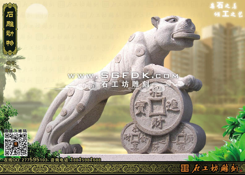 金錢豹,是一種大型兇猛的貓科動(dòng)物,其體形似虎,身長(zhǎng)一般約有一米左右,頭偏圓、耳小。全身棕黃而遍布黑褐色金錢花斑,因此而得名金錢豹故名,金錢豹又常秒作銀豹子。另外還有一種金錢豹,其通體暗黑褐,細(xì)觀仍見(jiàn)圓形斑,常被稱為墨豹。金錢豹是一種大型的食肉動(dòng)物。其身體敏捷,能跳善爬,生性兇猛狡猾甚至能獵食鹿等大型動(dòng)物,偷襲食草動(dòng)物。金錢豹因其遍布全身的金錢紋而深入人們的喜歡,在園林景觀雕塑的創(chuàng)作當(dāng)中,雕刻工匠也常根據(jù)金錢豹這也獨(dú)特的性質(zhì)進(jìn)行創(chuàng)意,把金錢豹的全知的紋飾具體化成銅錢的圖案,而其嘴里則常飾以銅錢,寓意招財(cái)進(jìn)寶之意。